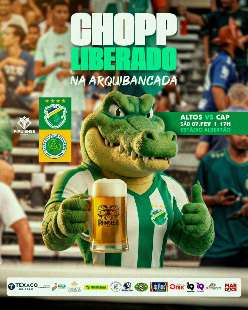 O Associação Atlética de Altos anunciou uma ação especial para animar a torcida no confronto deste sábado (7) contra o Atlético Piauiense, válido pela 5ª rodada do Campeonato Piauiense Série A 2026. O clube liberou 200 litros de chopp gratuito para os torcedores que estiverem no Estádio Albertão, em Teresina, onde o confronto será disputado às 17h.